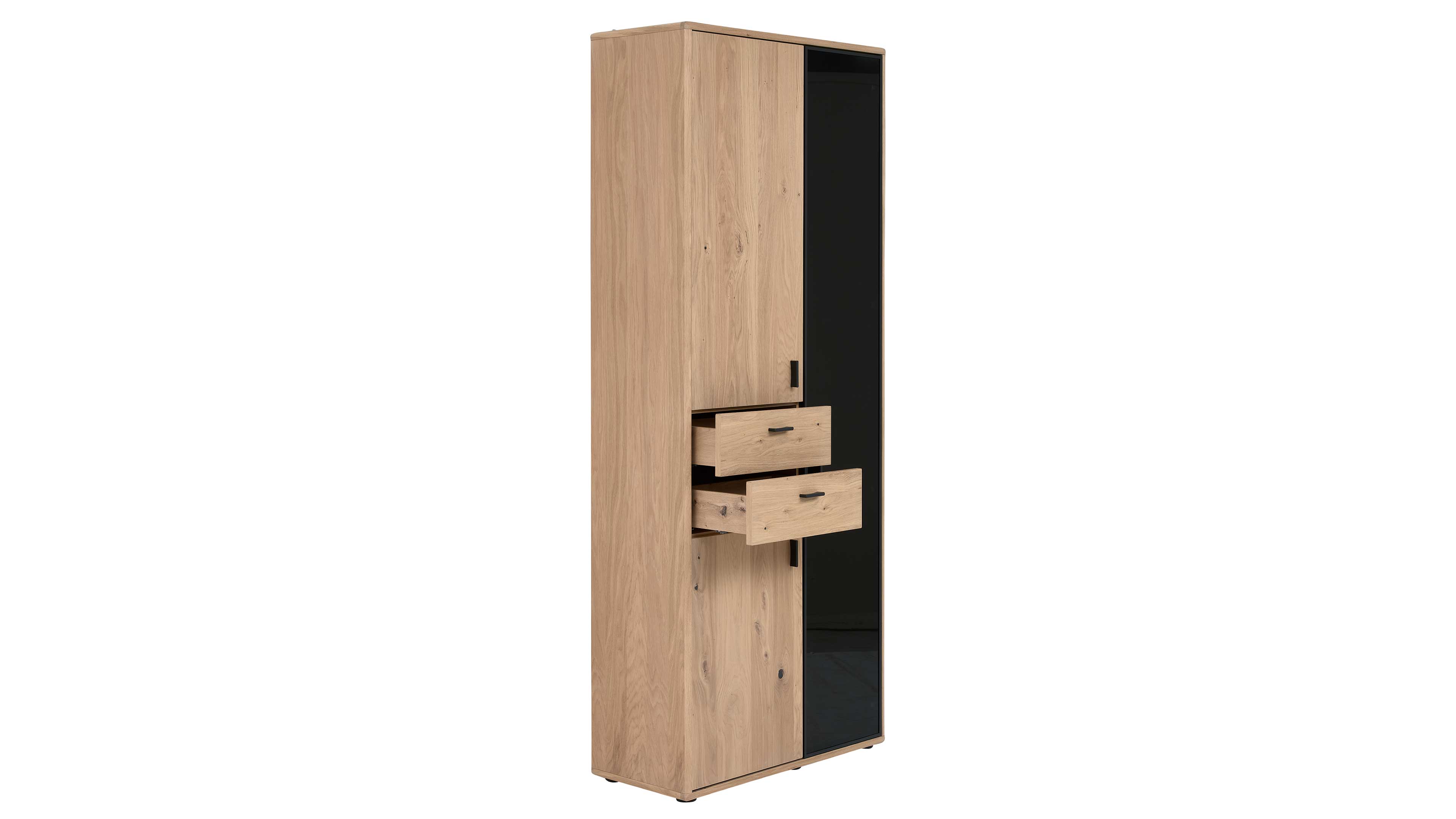TV-Board, hohe zweiteilige Vitrine und Wandpaneel mit Glaselementen in Kerneiche