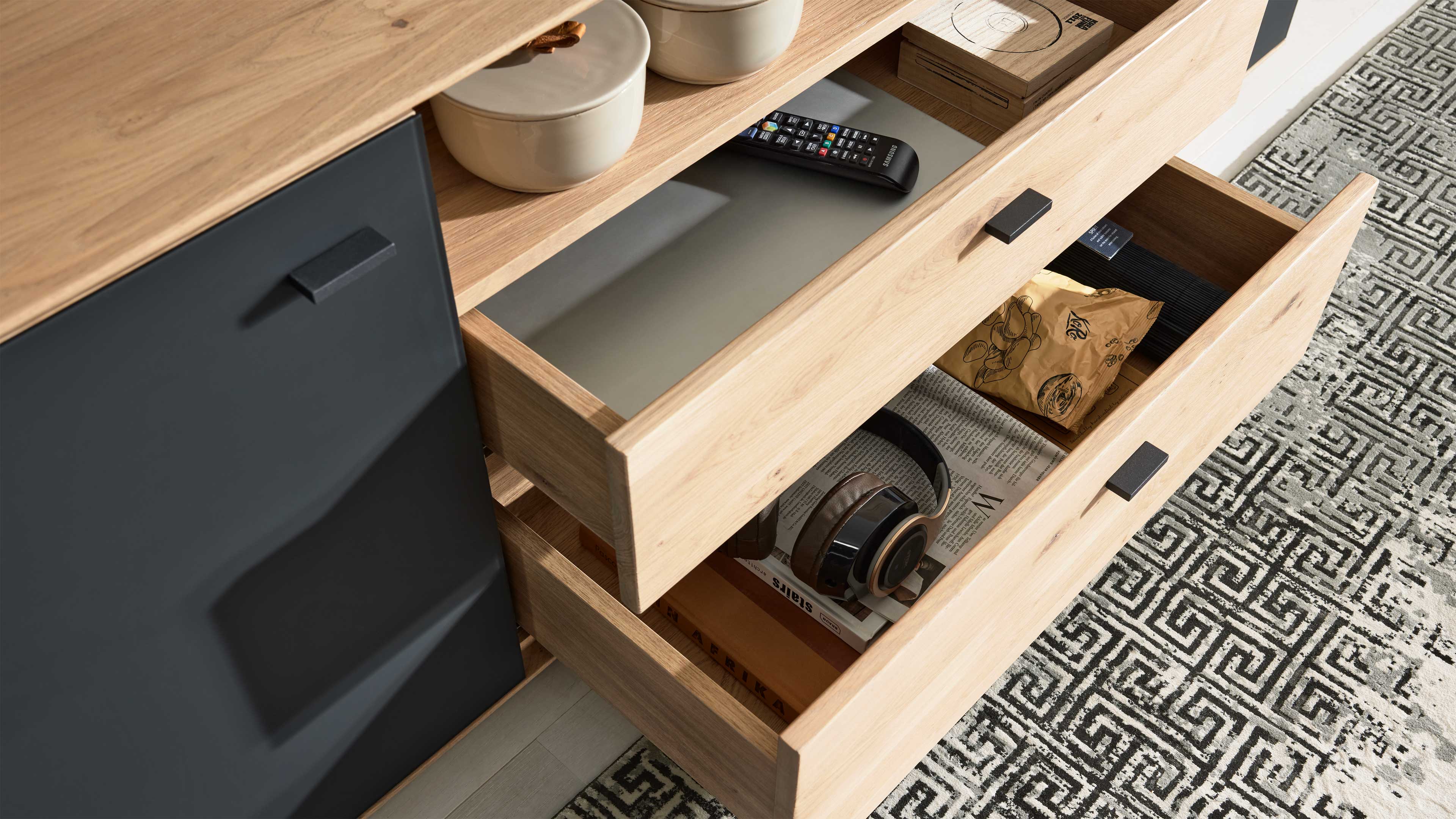 Das TV-Unterteil bietet mit ca. 165 x 62 x 50 cm (BxHxT) viel Platz für Technik und Zubehör. Es verfügt über zwei Türen, ein offenes Fach und zwei Schubladen, die durch ihre Softclose-Funktion besonders komfortabel in der Handhabung sind.