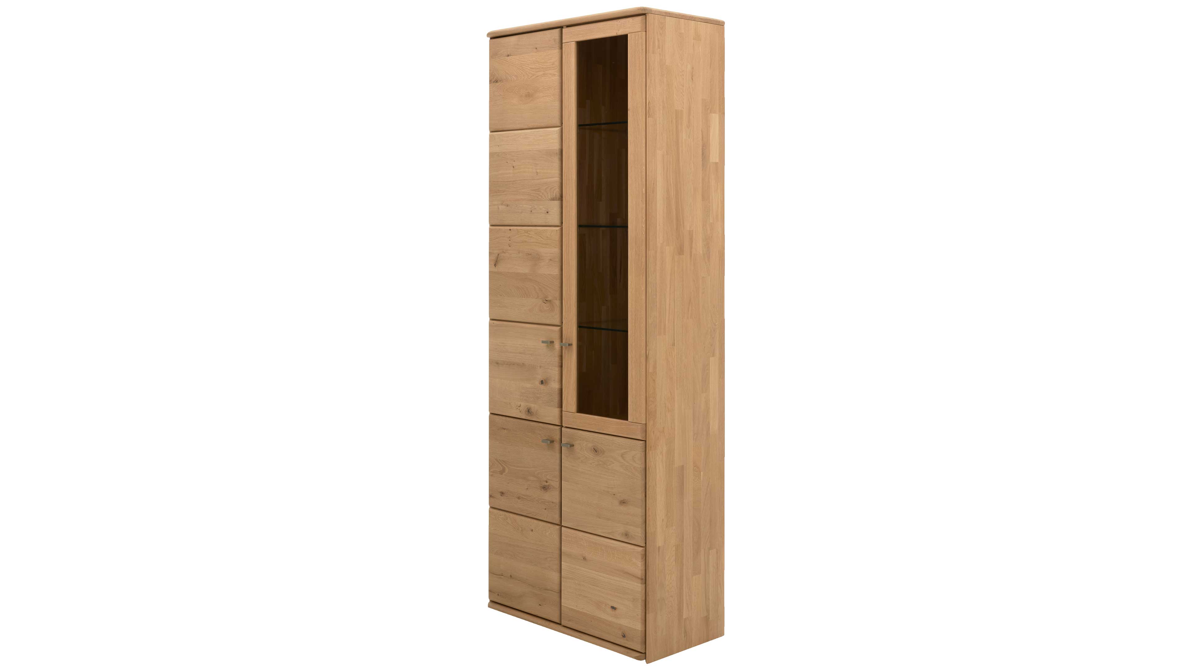 Eine Vitrine mit Glastür und drei Glasböden setzt deine Lieblingsstücke perfekt in Szene. Hinter drei Holztüren mit fünf Böden findest du reichlich Stauraum – Maße ca. 82 x 217 x 42 cm (BxHxT).
