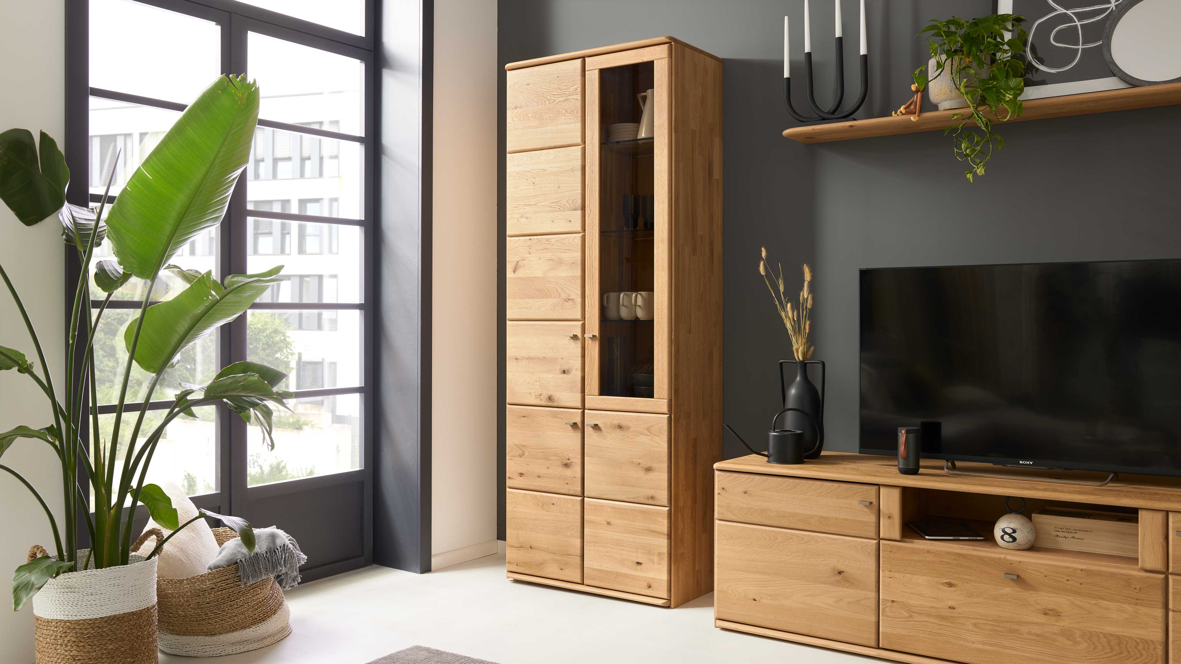 Die Vitrine aus der Interliving Wohnzimmer Serie 2028 kombiniert großzügigen Stauraum mit einer eleganten, modernen Optik. Gefertigt aus soft gebürsteter und geölter Wildeiche und veredelt mit Klarglaselementen sowie Metallgriffen, steht sie für natürliche Schönheit und funktionalen Wohnkomfort – perfekt für dich, wenn du Wert auf Stil, Struktur und hochwertige Materialien legst.
