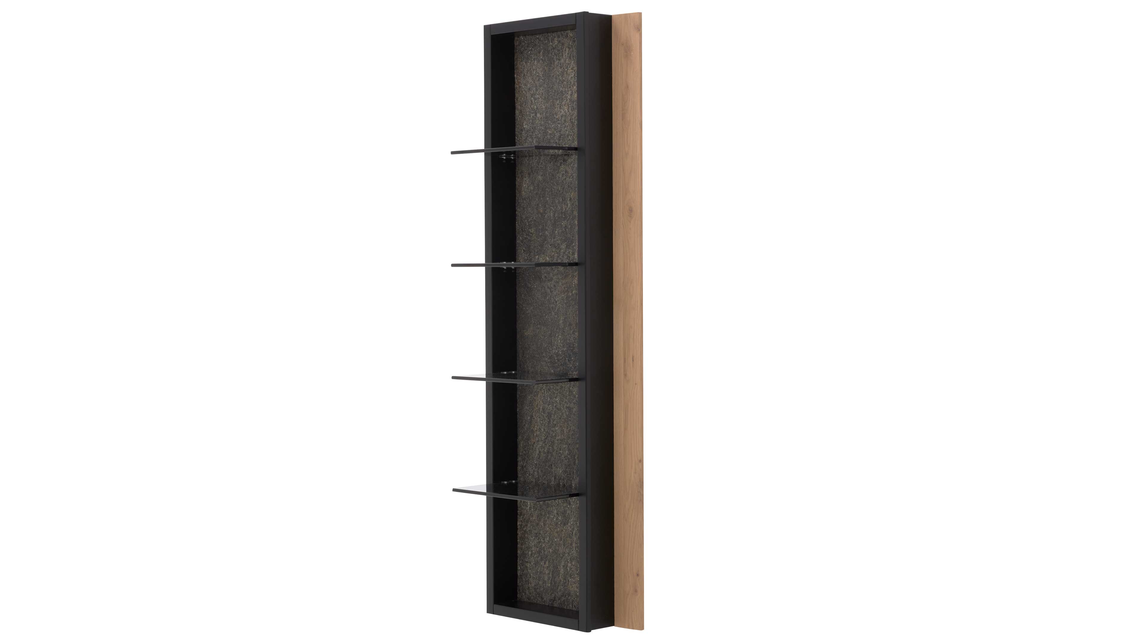 Wandregal mit vier Glasböden und Metallrahmen mit Akzenten in Wildeiche