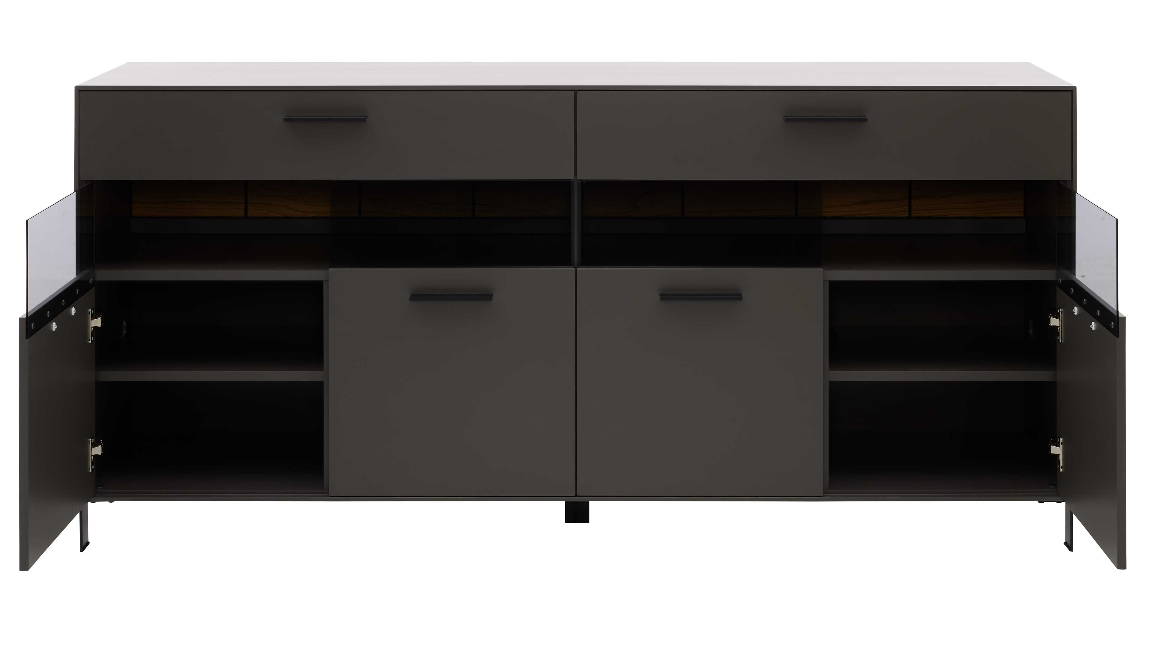 Das Sideboard 47 05 MH 21 aus der Interliving Wohnzimmer Serie 2030 vereint moderne Ästhetik mit durchdachtem Stauraum – ideal als Solitärmöbel im Wohn- oder Esszimmer. Die wolframgrauen Lackoberflächen verleihen dem Möbelstück eine elegante Ausstrahlung. Für einen raffinierten Look sorgen Einsätze aus grauem Parsolglas, sichtbare Rückwände mit Spaltholz auf schwarzer MDF und filigrane Details aus schwarz lackiertem Metall mit Feinstruktur.