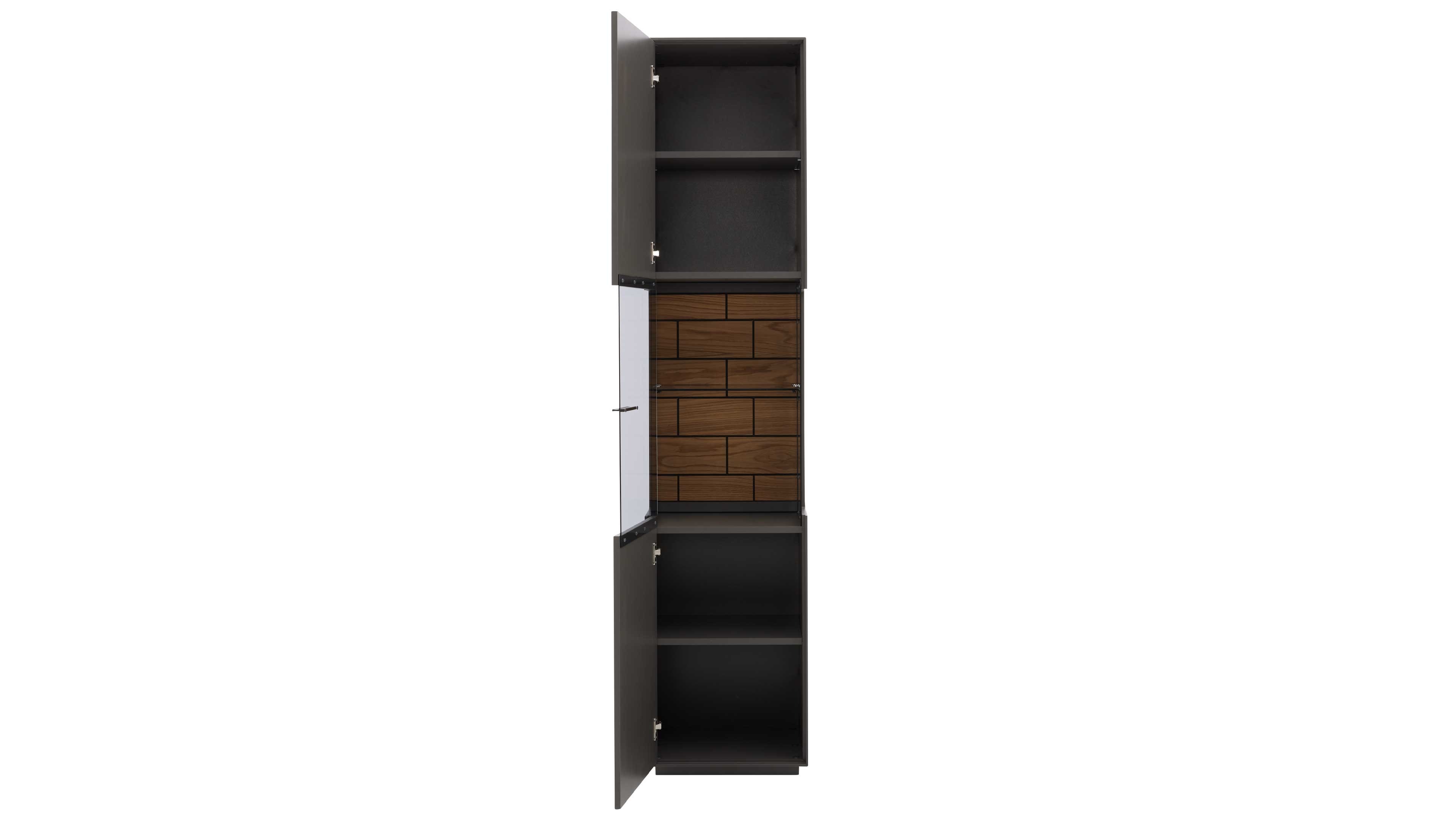 Die Vitrine aus der Interliving Wohnzimmer Serie 2030 vereint modernes Design mit praktischer Aufteilung – perfekt als stilvoller Glasschrank, Einzelvitrine oder eleganter Solitär im Wohn- oder Esszimmer. Die wolframgrauen Lackoberflächen verleihen dem Möbelstück eine ruhige, edle Ausstrahlung. Für spannende Akzente sorgen graues Parsolglas, eine sichtbare Rückwand mit Spaltholz auf schwarzer MDF, ein Holzsockel sowie ein Griff aus schwarz lackiertem Metall mit feiner Struktur. So entsteht ein harmonisches Gesamtbild mit einem Hauch von Exklusivität.