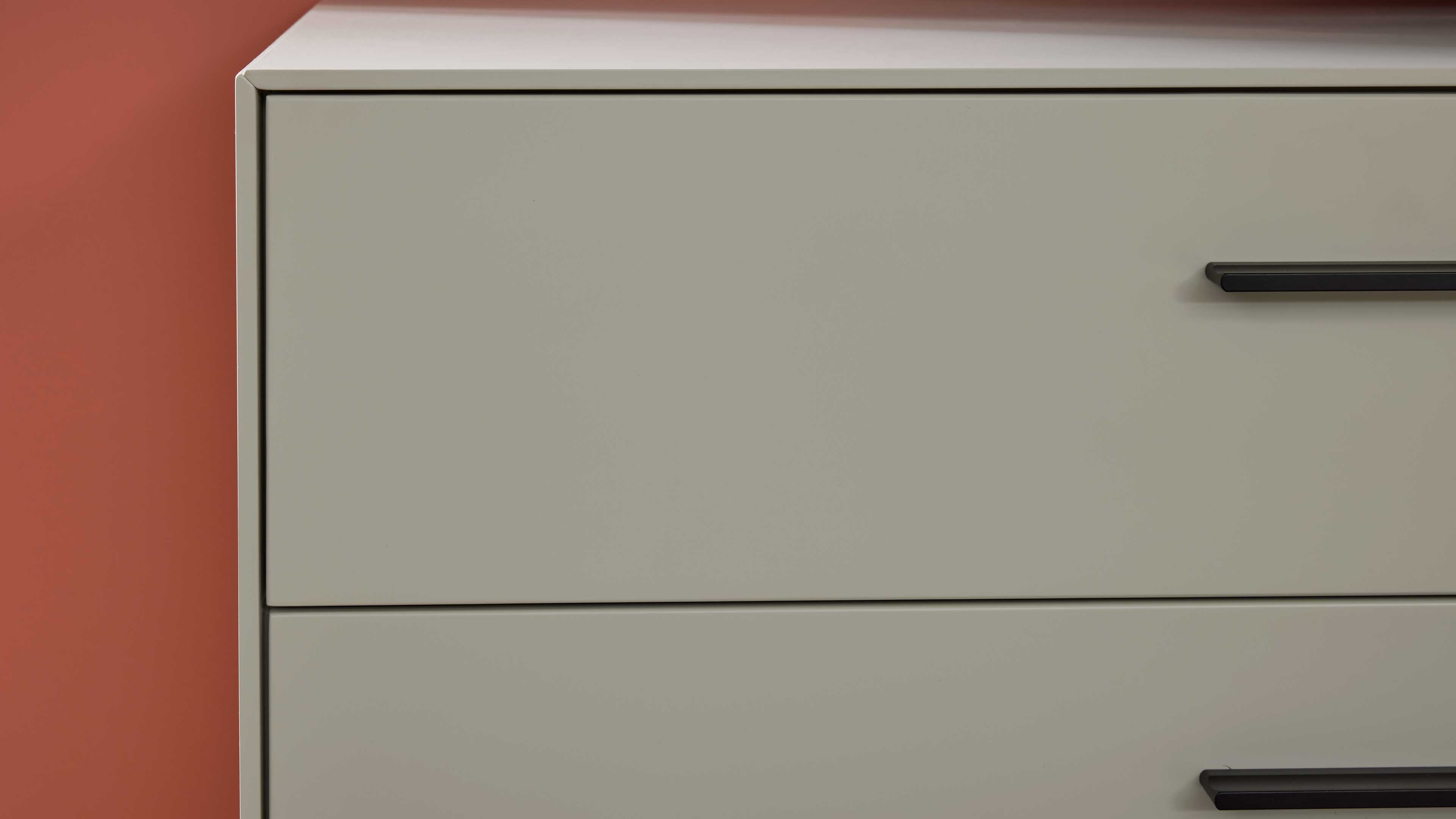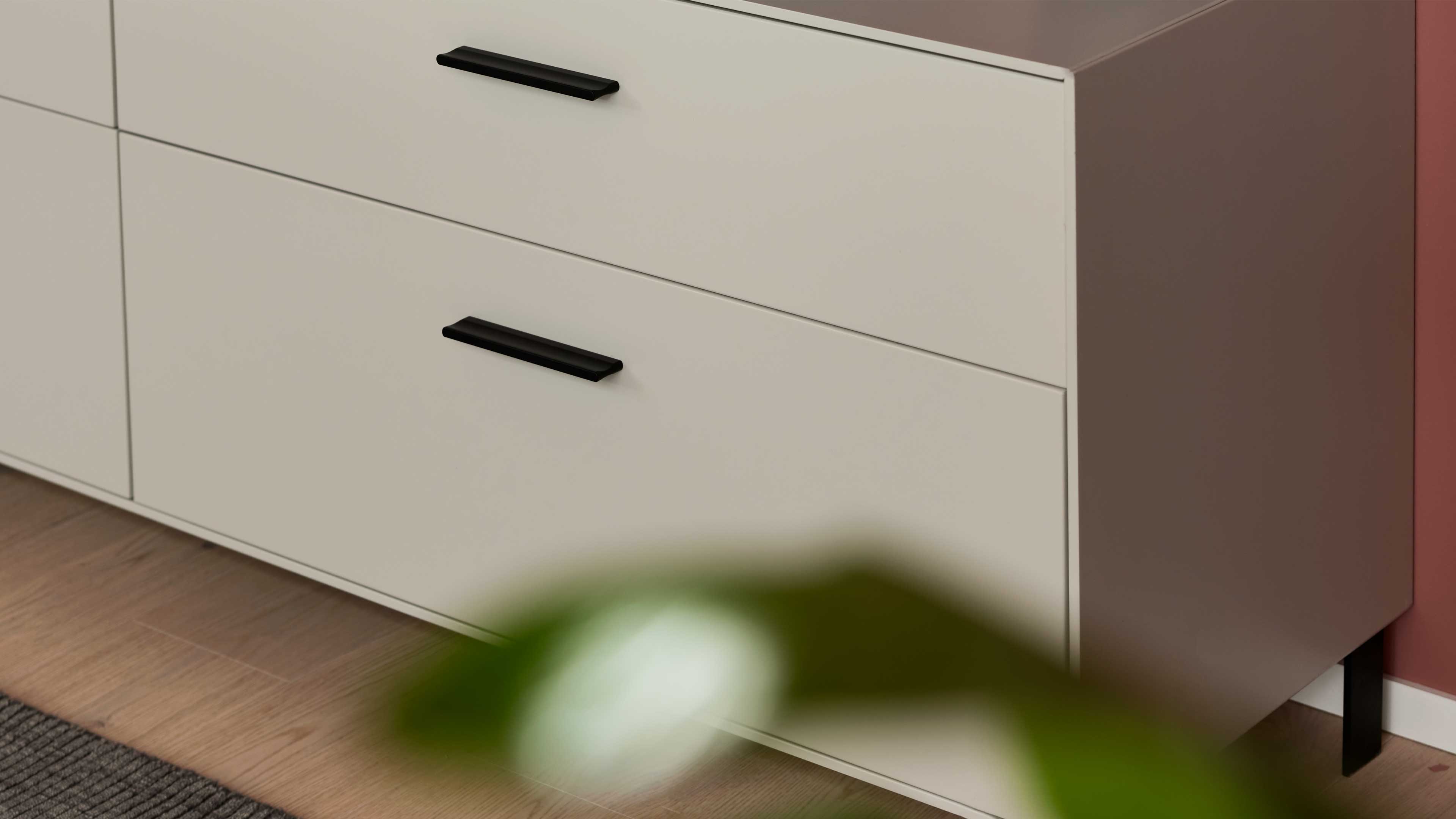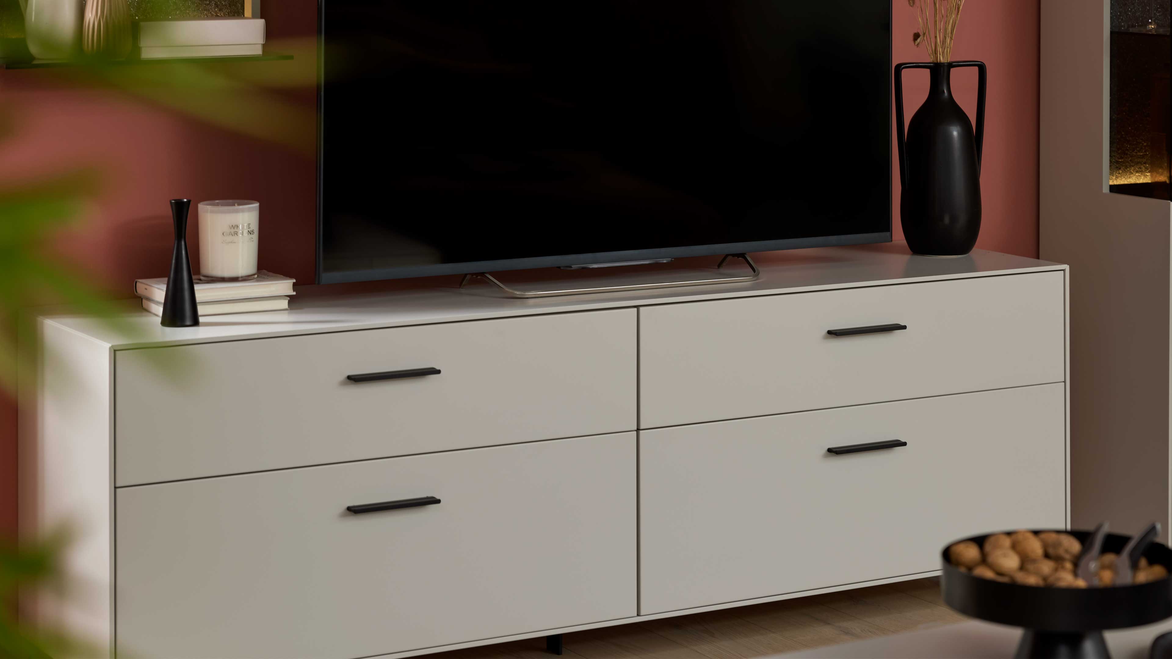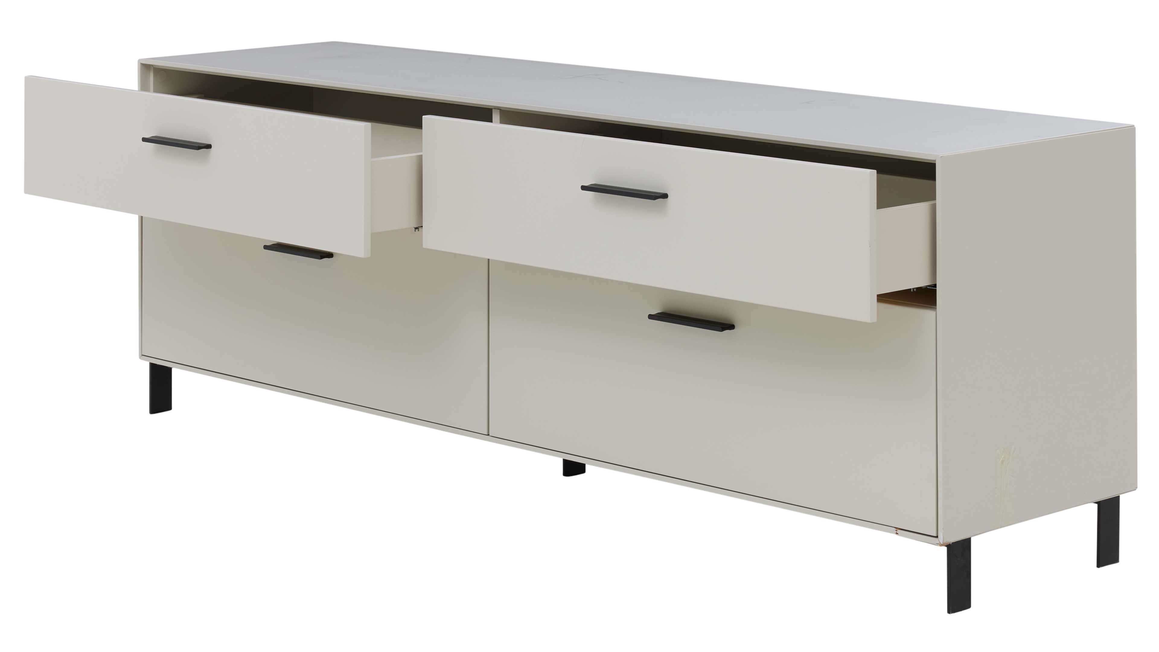 Das Lowboard aus der Interliving Wohnzimmer Serie 2030 PLUS vereint modernes Design mit cleverem Stauraumkonzept – perfekt für stilvolle Wohnräume mit Anspruch. Die Sahara cremefarbenen Lackoberflächen verleihen dem Möbelstück eine warme, elegante Note, während schwarz lackierte Metallgriffe und -füße mit Feinstruktur für einen markanten Kontrast sorgen. So entsteht ein edles Gesamtbild, das sich harmonisch in zeitgemäße Wohnkonzepte einfügt.