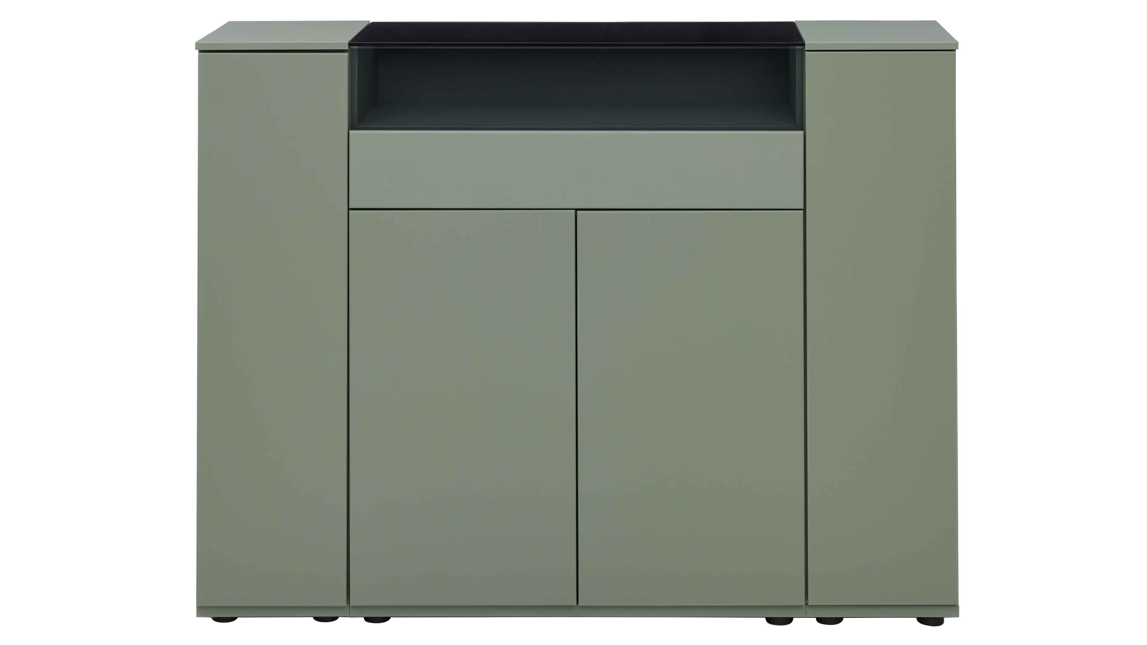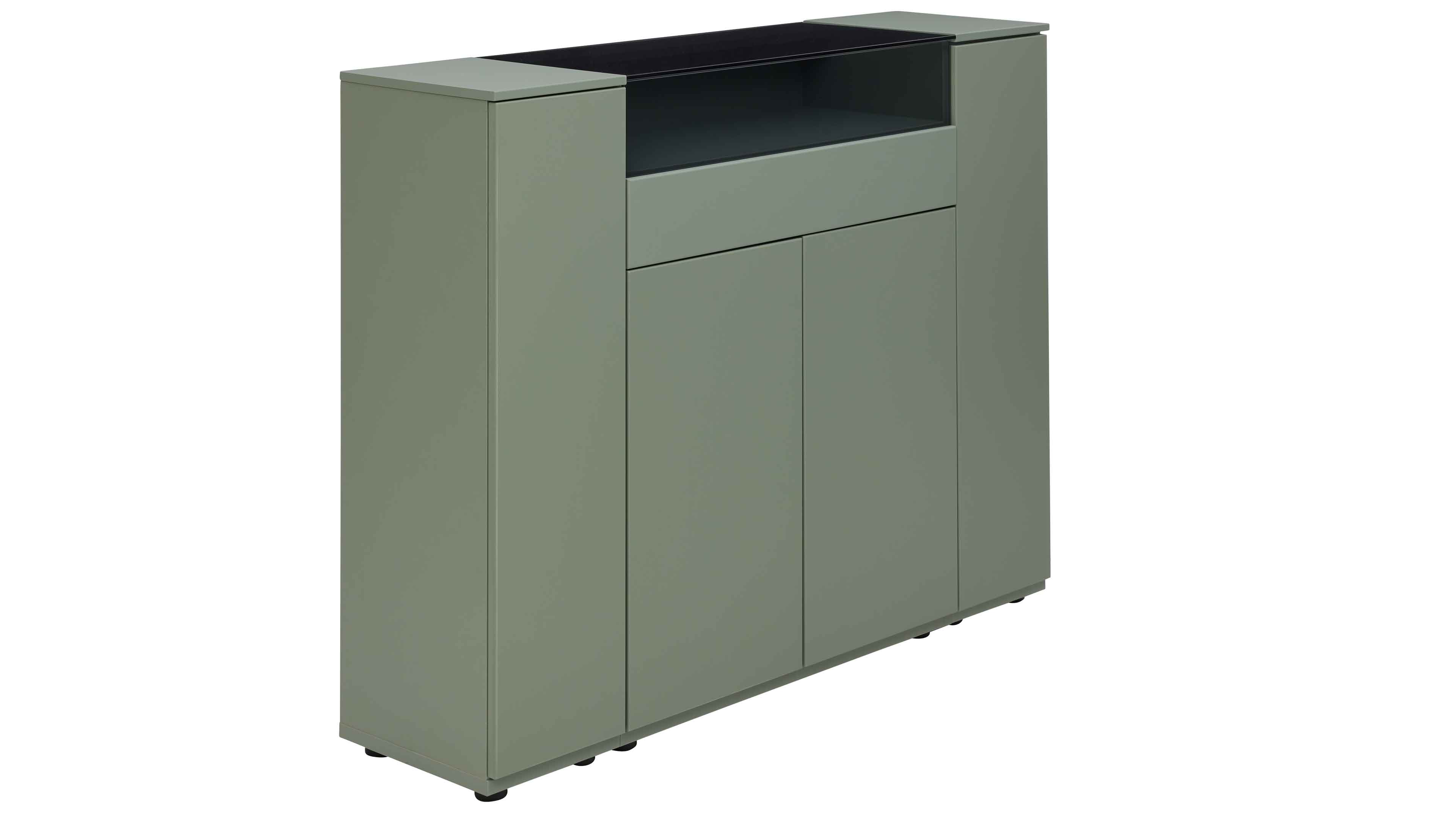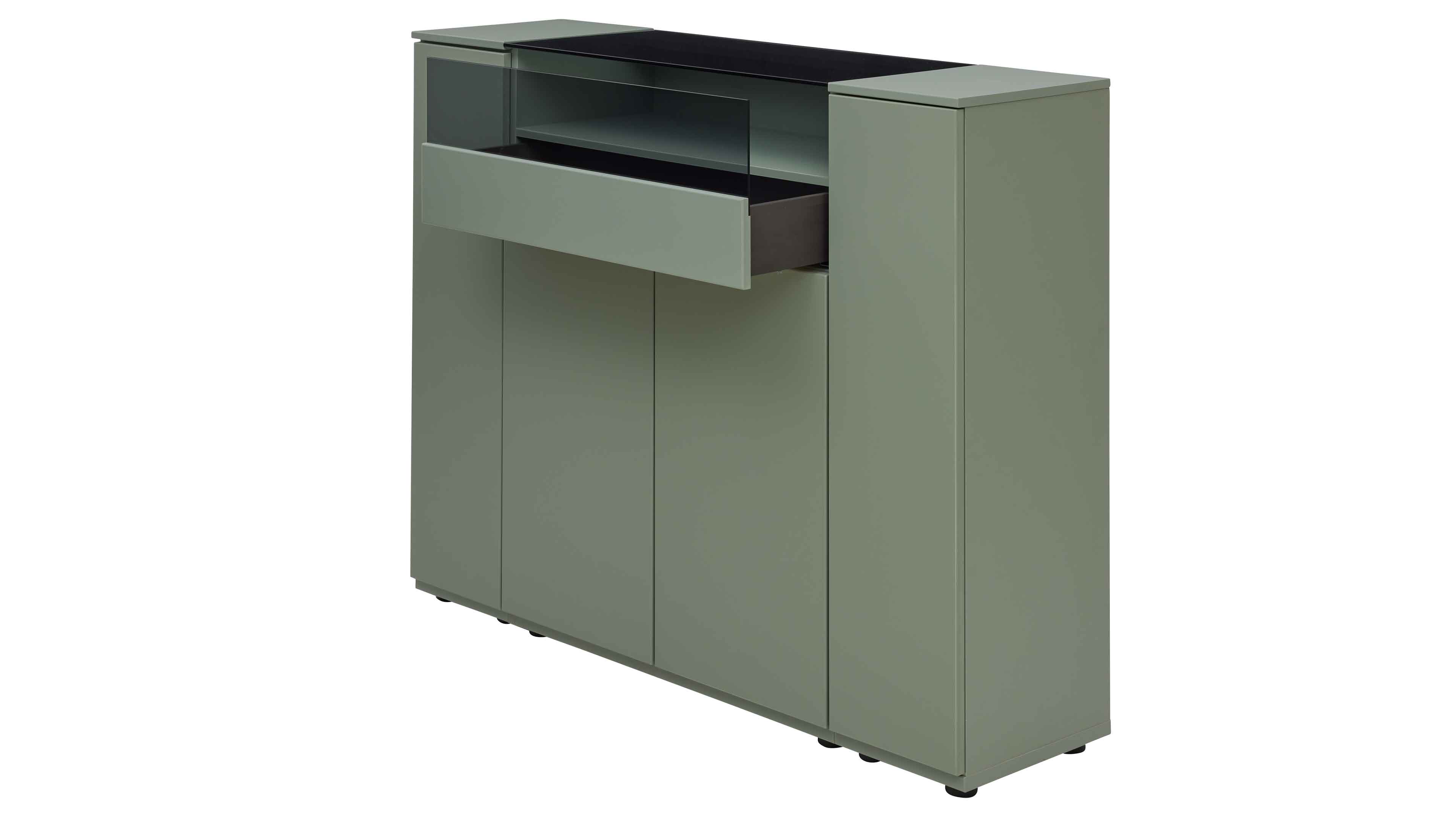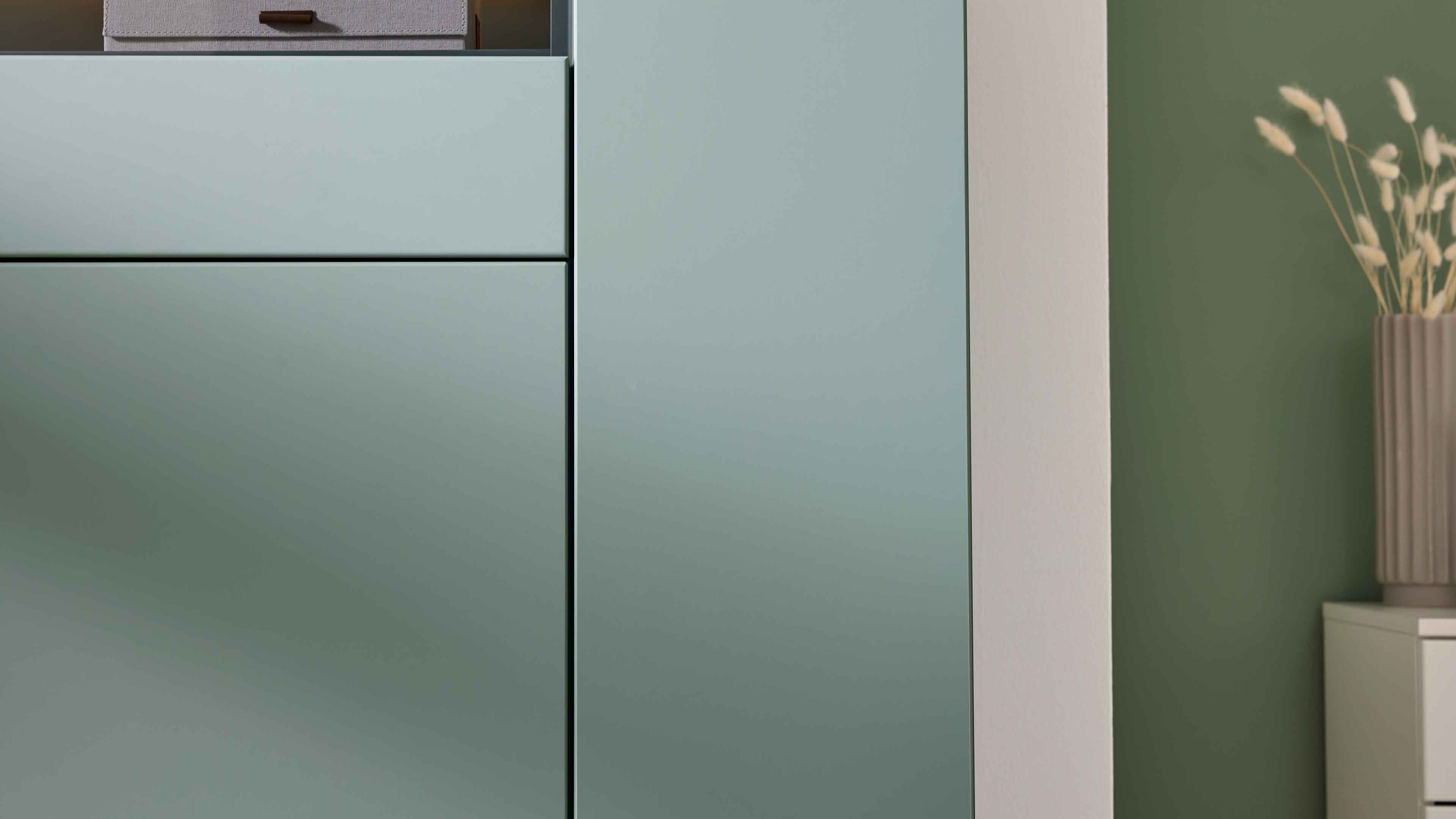 Die Melaminoberflächen der Serie sind kratzfest, UV-beständig, strapazierfähig und pflegeleicht – ideal für den täglichen Gebrauch. Die Kombination aus Schilfgrün matt und Floatglas sorgt für eine harmonische Balance aus Natürlichkeit und Eleganz und verleiht deinem Wohnraum eine moderne, individuelle Note.