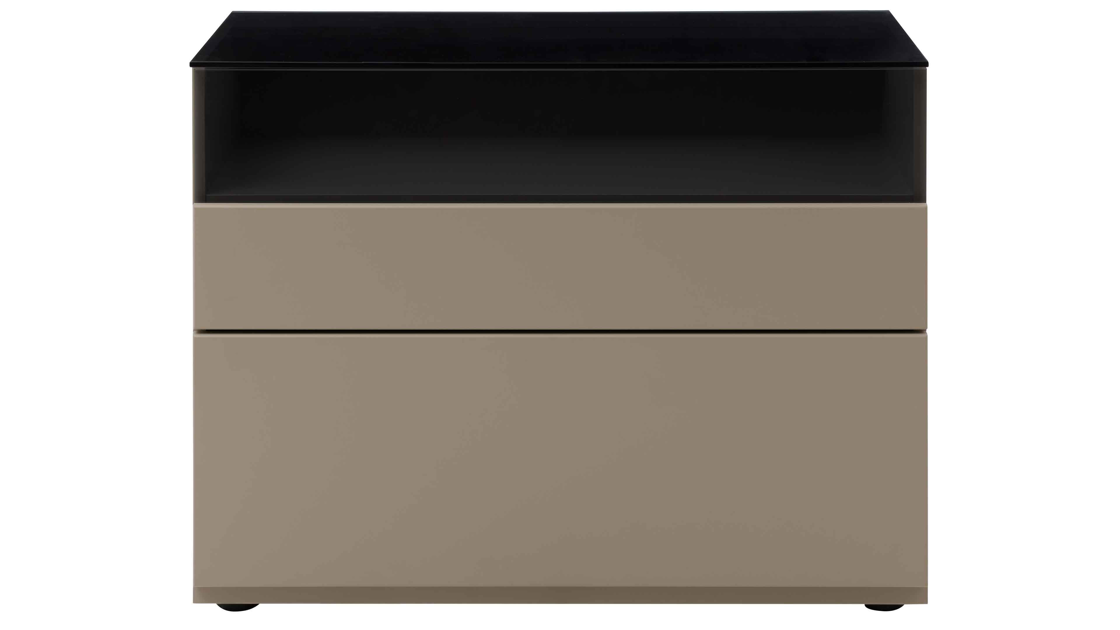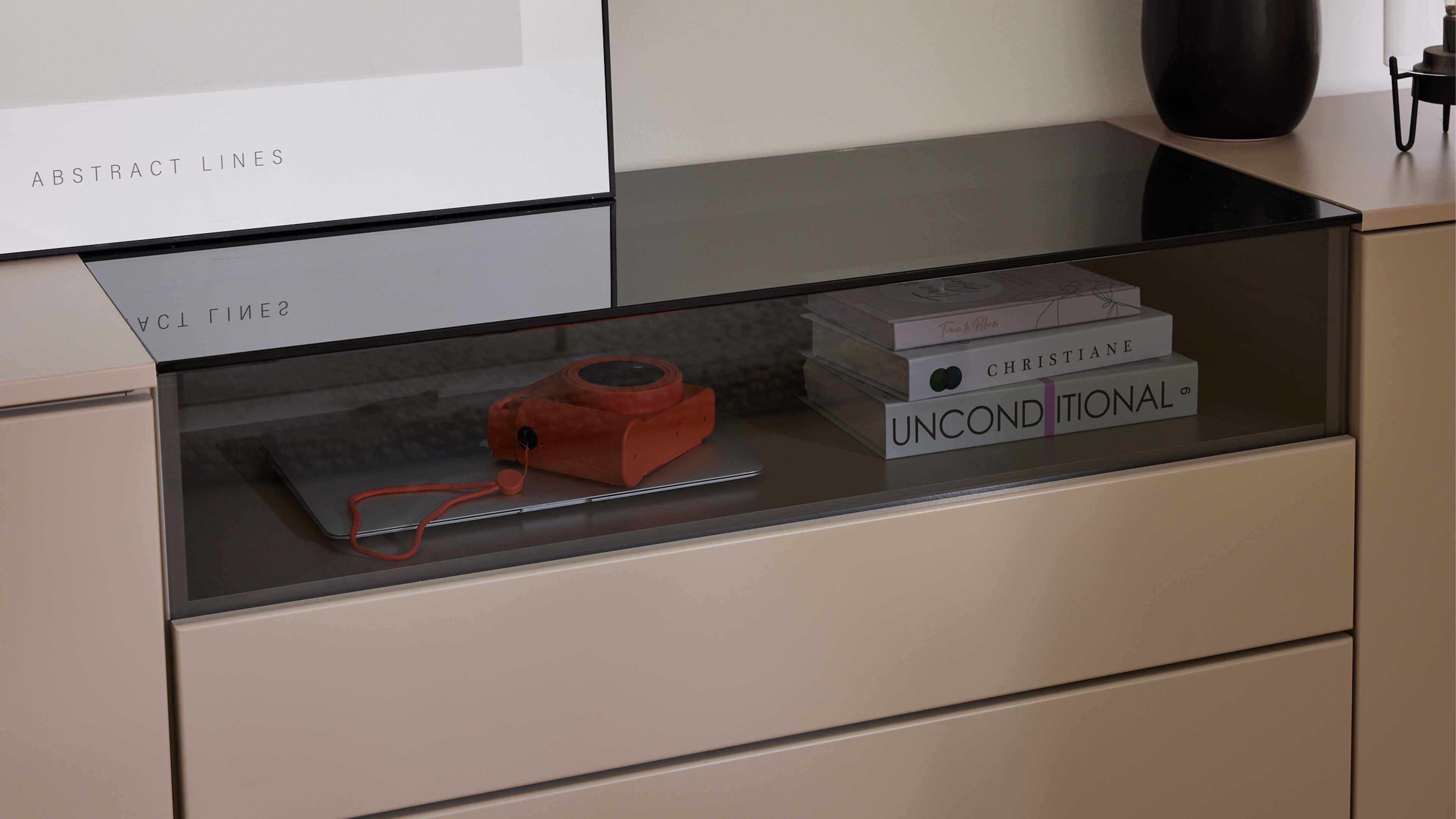 Das Sideboard besteht aus drei perfekt abgestimmten Elementen. Links befindet sich ein Element mit einer Tür und einem höhenverstellbaren Holzboden – ideal für Geschirr, Gläser oder Alltagsutensilien. In der Mitte überzeugt ein Element mit einer Schublade mit Glasfront und Glasoberboden sowie einer weiteren klassischen Schublade – ideal für Besteck, Servietten oder andere Kleinigkeiten. Rechts ergänzt ein Element die Kombination mit einer Tür und einem höhenverstellbaren Holzboden, sodass du viel Platz für Ordnung und Struktur hast.