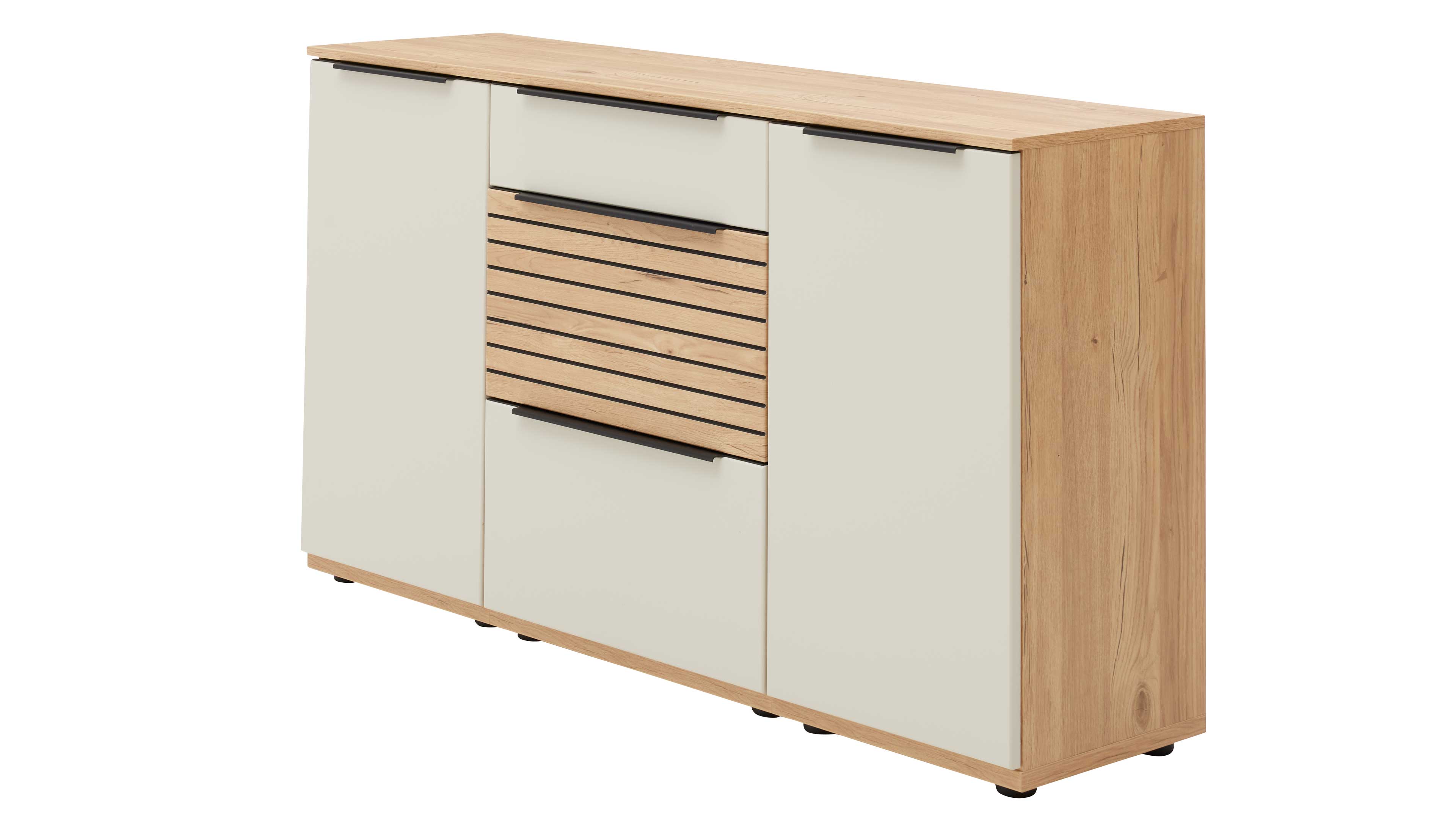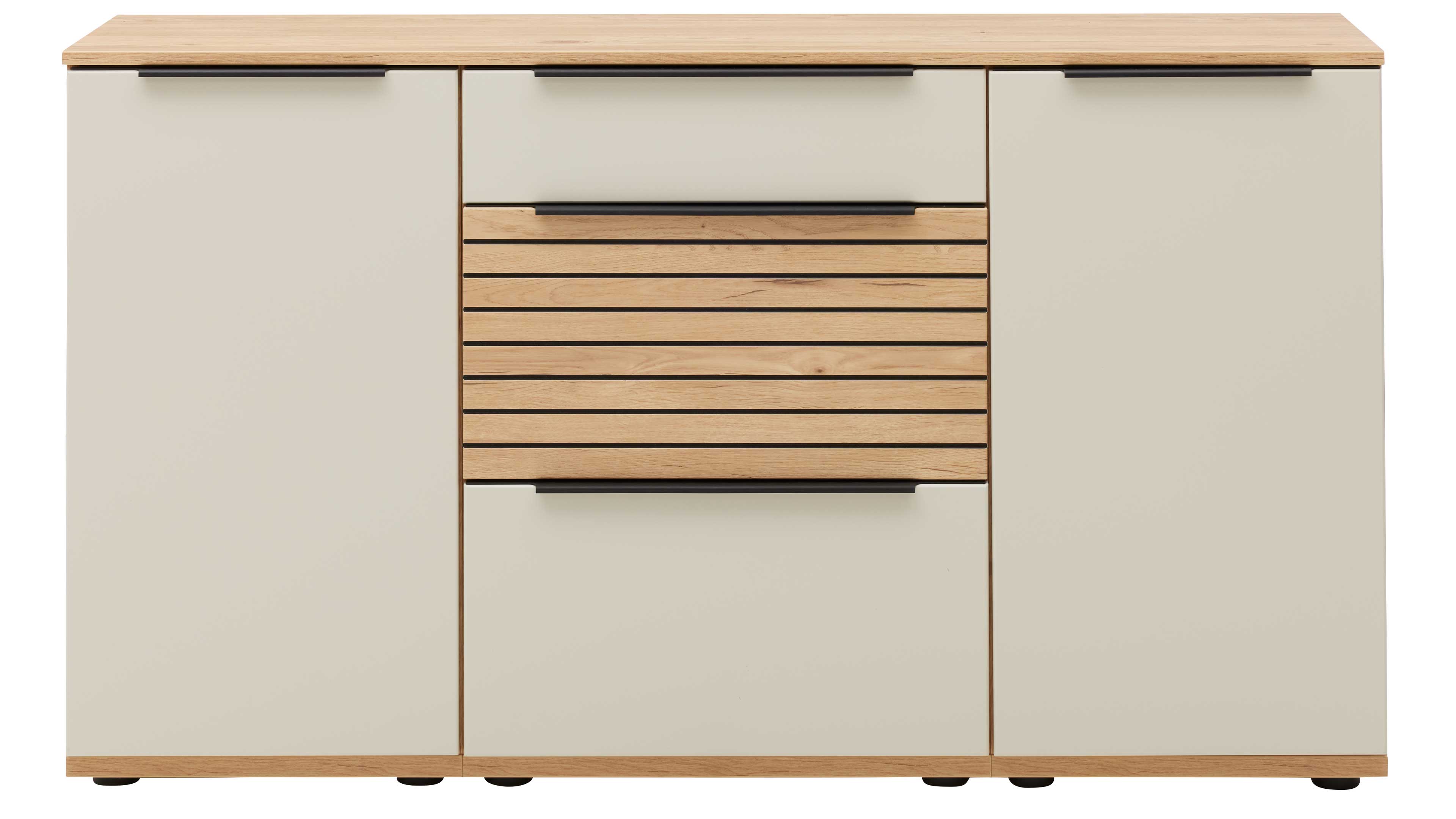 Das Sideboard mit ca. 150 x 85 x 40 cm (B/LxHxT) bietet Stauraum mit Struktur. Es besteht aus zwei Türen mit jeweils zwei höhenverstellbaren Holzböden sowie einem mittigen Schubladenelement mit drei leichtgängigen Schubladen inklusive Softauszug. Türen mit Schließdämpfung, robuste Melaminharz-Oberflächen und vormontierte Korpusse sorgen für langlebige Qualität und komfortable Handhabung. Die Kombination aus Korpus, Deckblatt und Frontplanke in Risseiche Nachbildung und Fronten in Matt-Sandbeige rundet das elegante Gesamtbild ab.