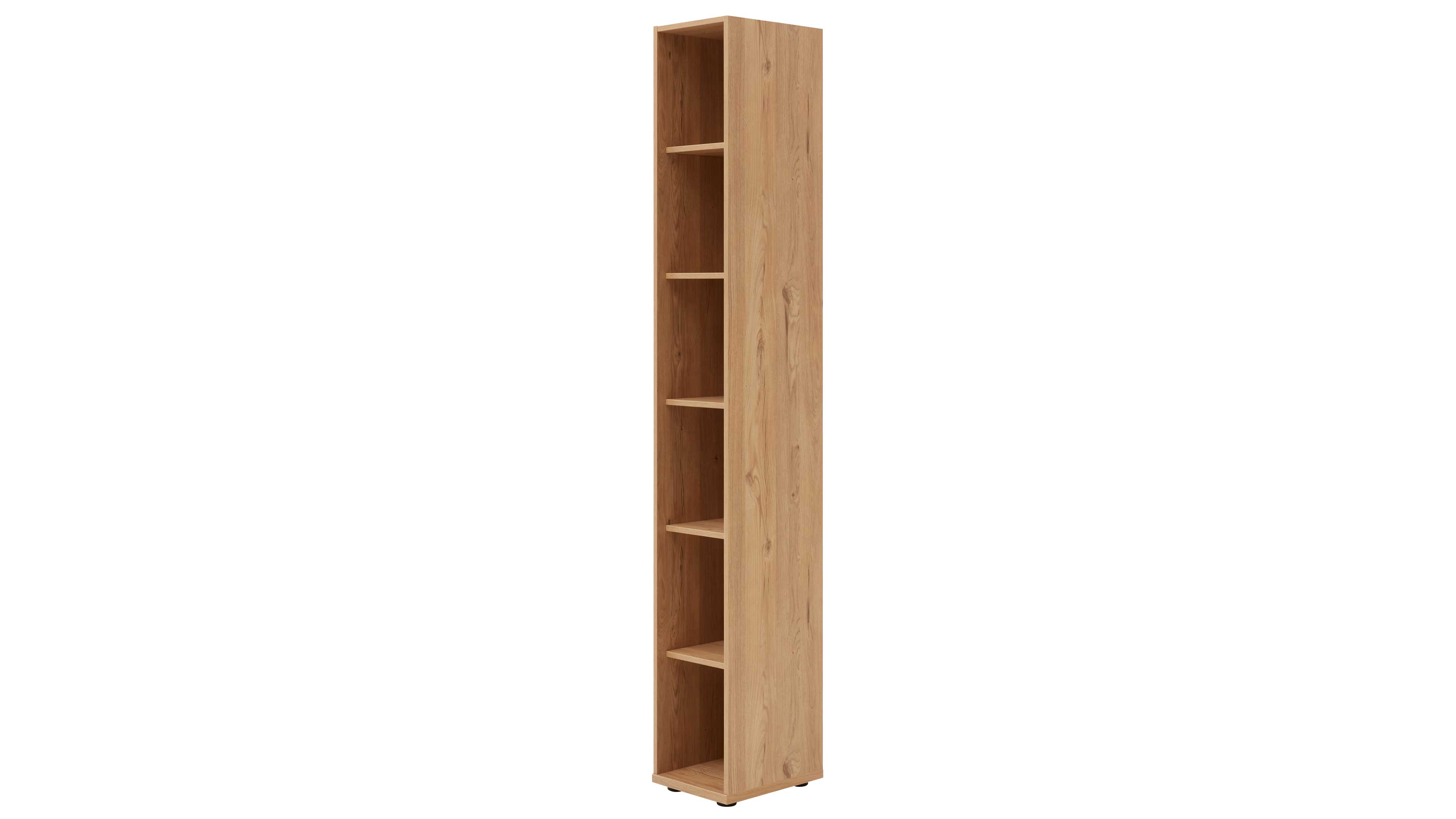 Das Regal mit ca. 90 x 215 x 40 cm (B/LxHxT) ergänzt das Sideboard perfekt. Zwei hohe Regalelemente mit jeweils fünf Holzböden und ein mittleres Aufsatz-Regal mit drei Böden schaffen Platz für Bücher, Deko oder persönliche Lieblingsstücke. Die filigrane Gestaltung in Risseiche Nachbildung verleiht der Kombination Leichtigkeit und Offenheit – funktional und dekorativ zugleich.