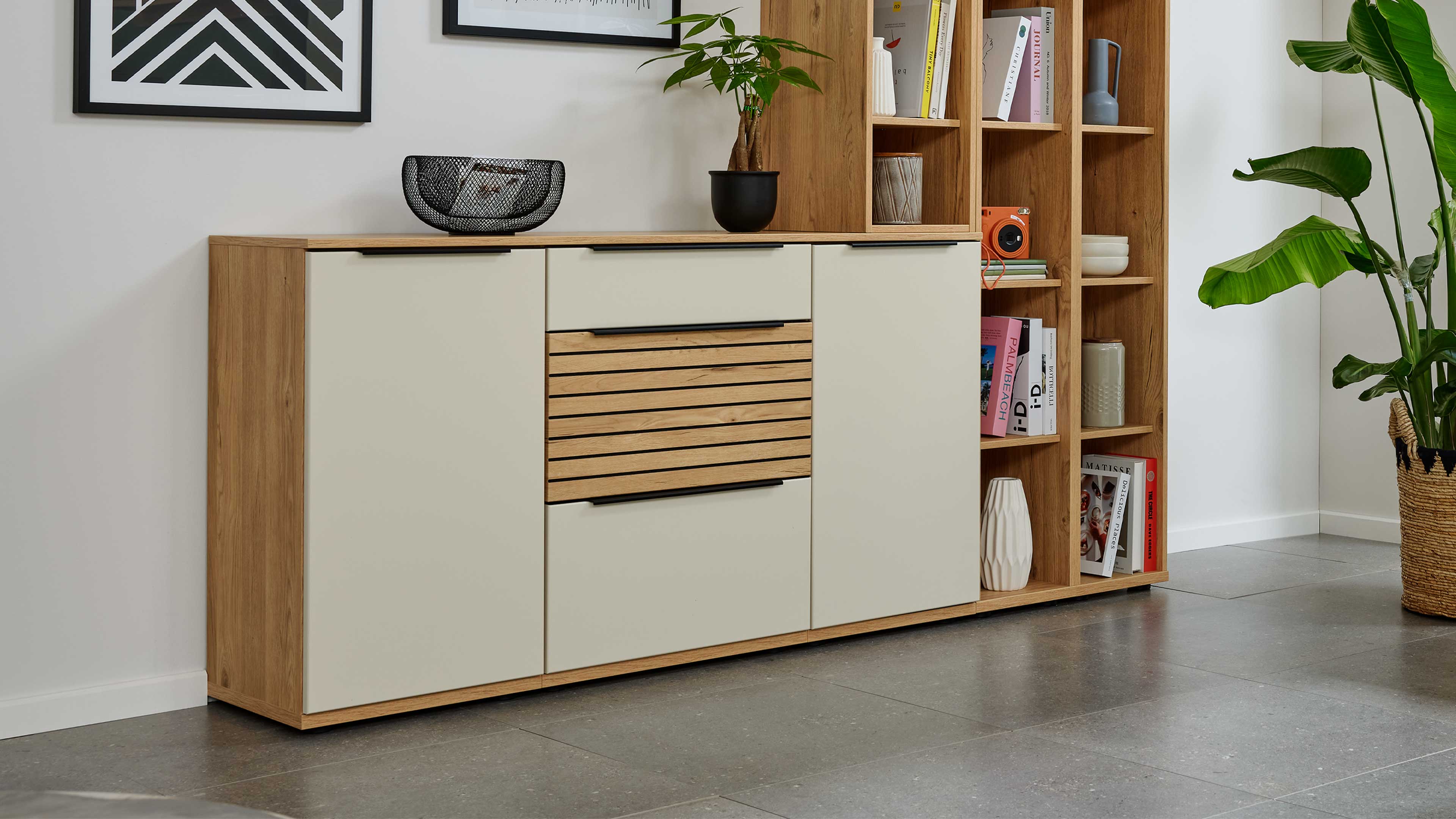 Die Sideboard- und Regalkombination aus der Interliving Wohnzimmer Serie 2032 vereint moderne Linienführung, natürliche Materialien und praktischen Stauraum zu einem harmonischen Gesamtbild. Risseiche Nachbildung und sandbeige Fronten in matter Optik verleihen dem Ensemble eine warme, elegante Ausstrahlung – perfekt für Wohn- und Essbereiche mit Stilbewusstsein und Sinn für Qualität.