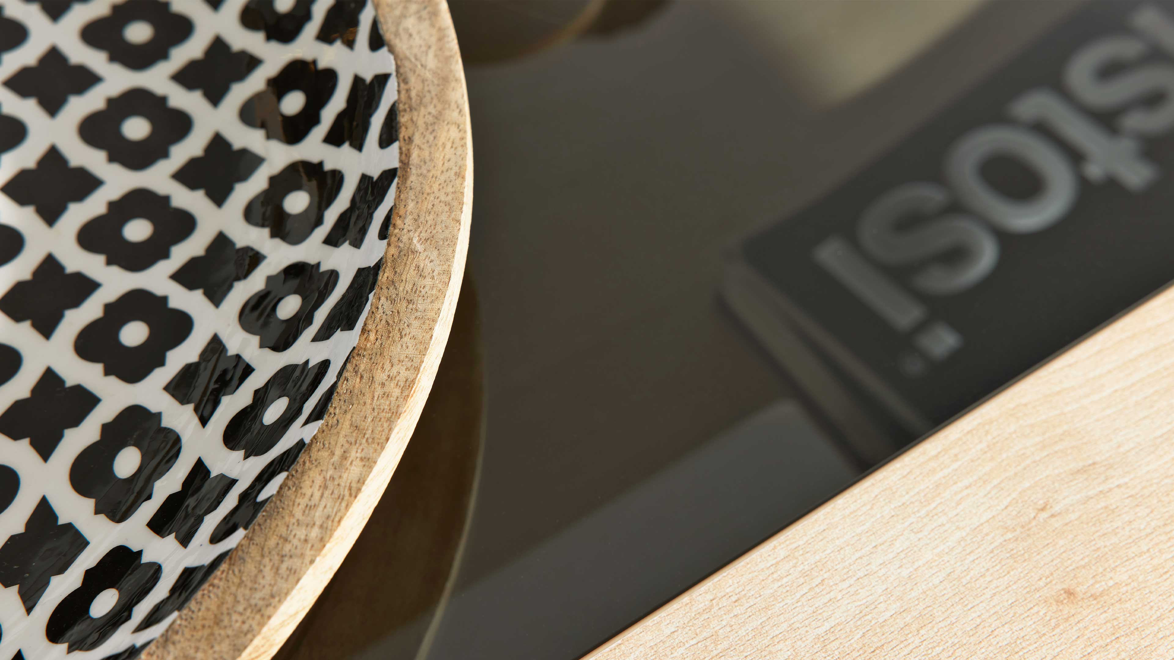 Die Einlage aus grau getöntem Glas ist nicht nur ein optisches Highlight, sondern auch besonders pflegeleicht und widerstandsfähig. Ein umlaufender ABS-Kantenschutz schützt den Tisch im Alltag zuverlässig vor Stößen – für eine langlebige, formschöne Optik.