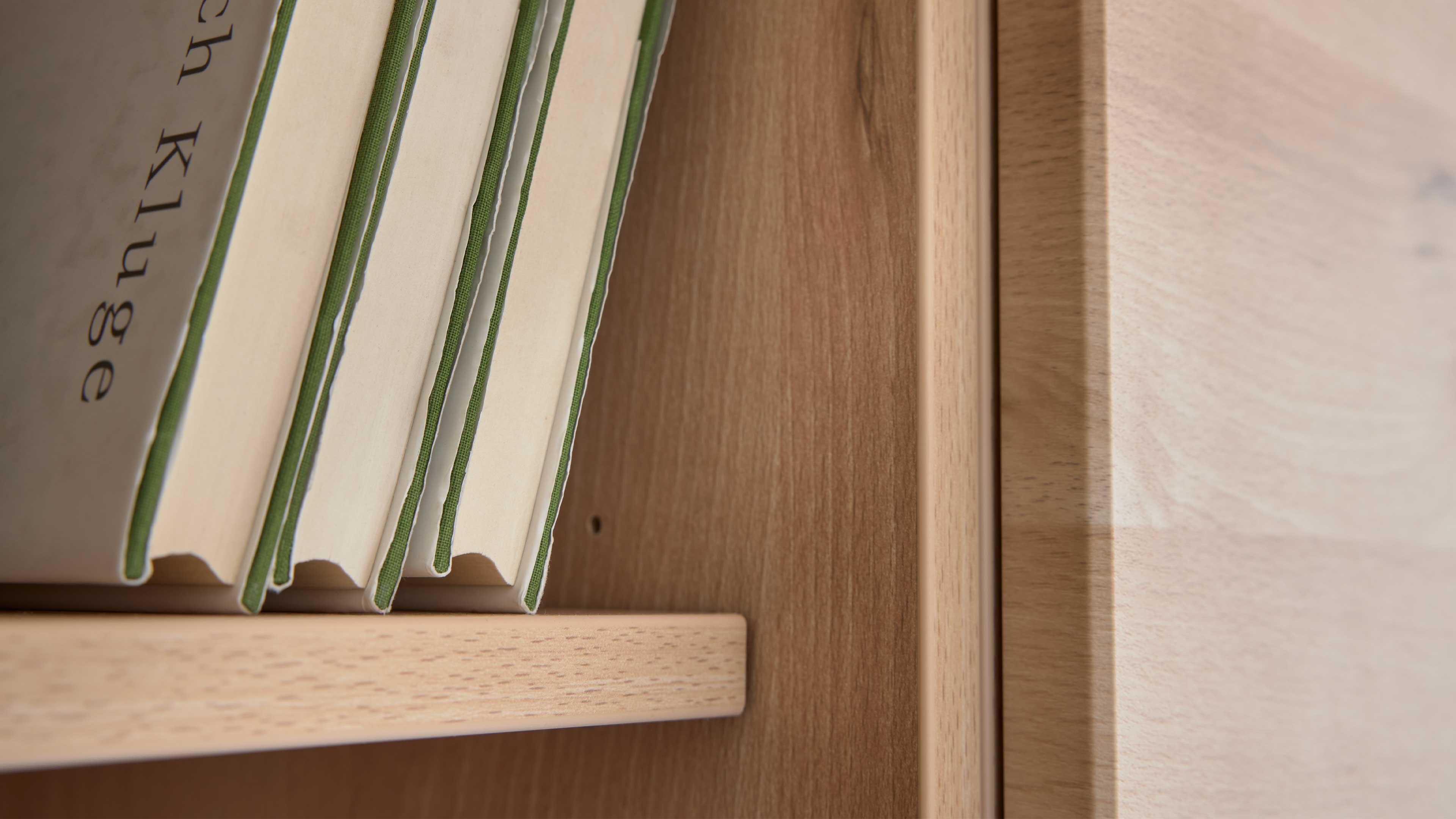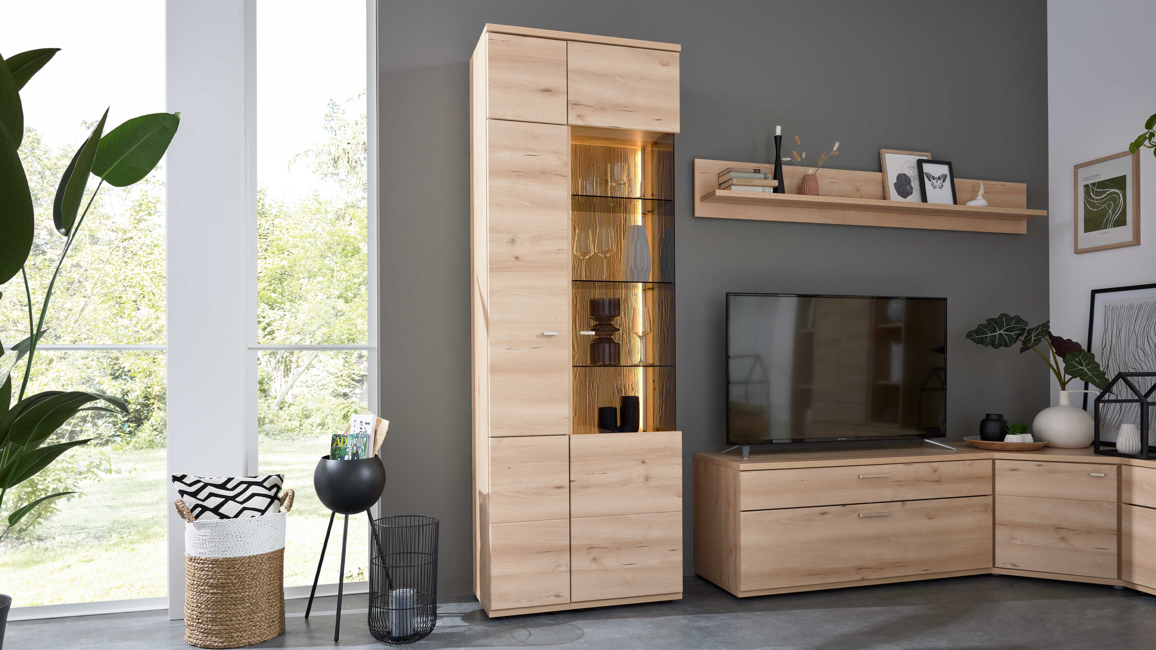 Wohnwand als Eck-Kombination mit offenem Regal und Vitrine in Naturbuche