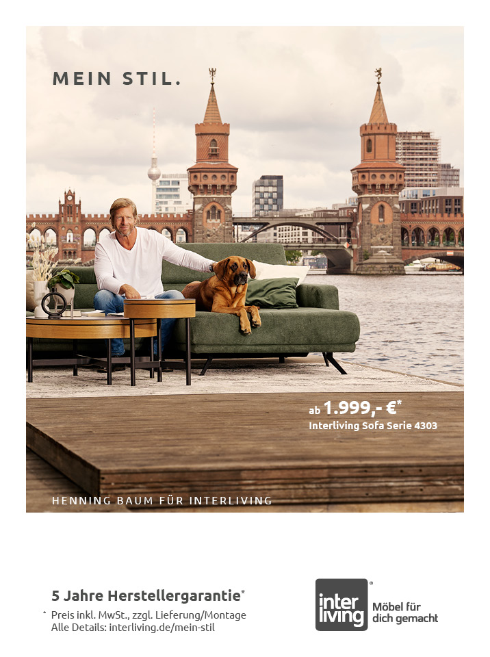 Unsere Interliving Kampagne „Mein Stil“ zeigt Schauspieler Henning Baum in außergewöhnlichen Szenen, die seine bodenständige und authentische Art perfekt mit den Werten von Interliving verbinden. Gedreht an eindrucksvollen Locations wie auf dem Teufelsberg in Berlin oder direkt auf der Spree, verdeutlichen die Spots, dass Interliving Möbel nicht nur funktional sind, sondern auch ein Lebensgefühl transportieren.