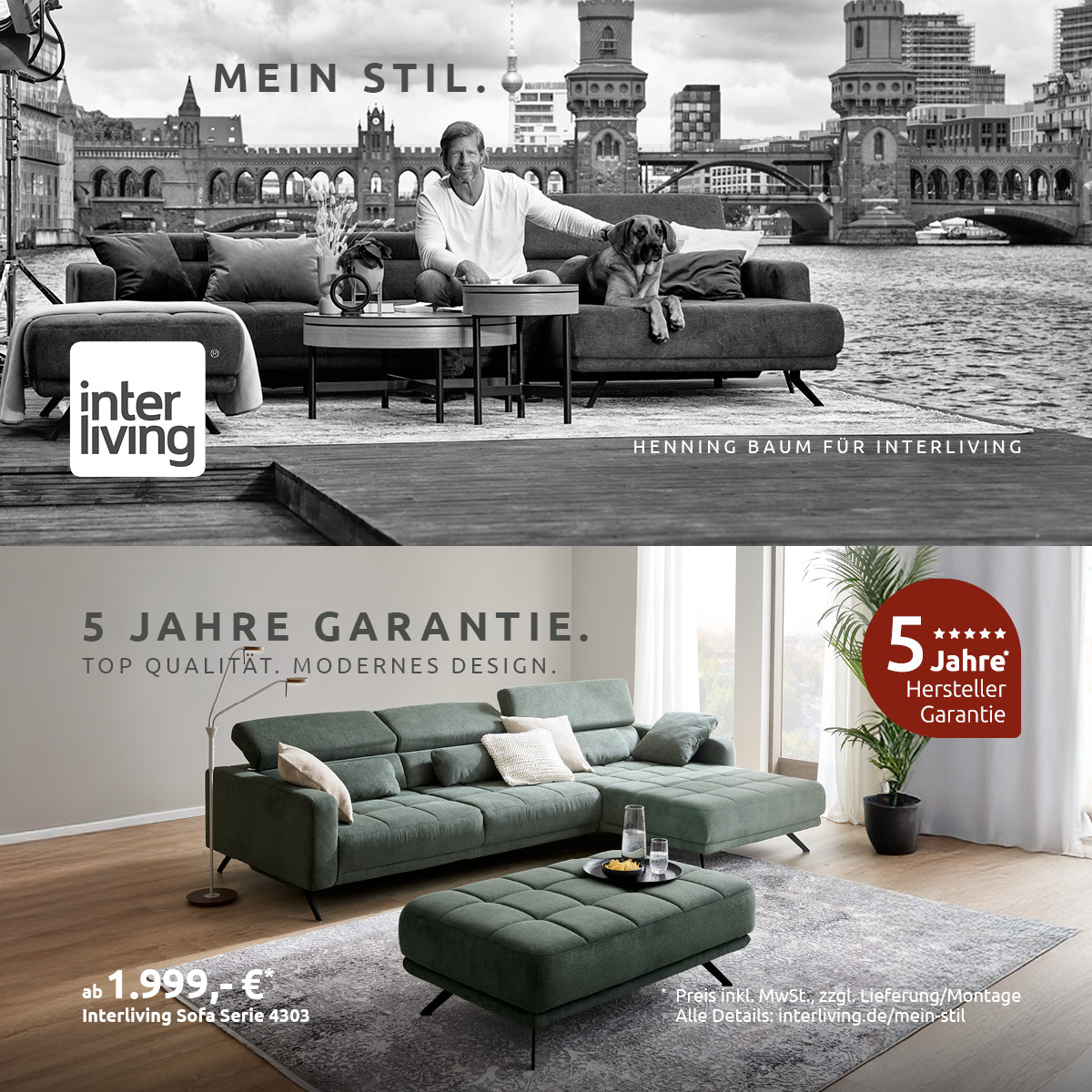 *Hinweise zur Aktion: Garantiebedingungen: Bis zu 5 Jahre Herstellergarantie – Bedingungen und weitere Informationen finden Sie auf interliving.de/service/garantie. Die Interliving Hersteller-Garantie wird freiwillig vergeben. Sie wird zusätzlich zu den gesetzlichen oder vertraglich vereinbarten Mängelansprüchen gewährt und schränkt diese nicht ein. Achtung: Dabei sind unbedingt die kompletten Garantiebedingungen zu beachten. Die Garantiebedingungen finden Sie in diesem Gütepass auf der Rückseite der Garantieurkunde. Interliving Sofa Serie 4303 Erhältlich bei allen Interliving Einrichtungshäusern. Preis inkl. MwSt., zzgl. Lieferung und Montage. Weitere Produkte und Dekorationen auf dem Bild (z.B. Hocker, Teppiche, Kissen, Lampen, Tablets und Gläser) sind nicht im Preis inbegriffen. Interliving Küche Serie 3085 Erhältlich bei allen Interliving Einrichtungshäusern. Preis inkl. MwSt., zzgl. Lieferung und Montage. Weitere Produkte und Dekorationen auf dem Bild (z.B. Vasen, Körbe, Töpfe, Tablets und Gläser) sind nicht im Preis inbegriffen. Zugabeaktion: Bei Planung einer Interliving Küche Serie 3085 erhalten Sie einen Siemens Geschirrspüler SN6IX14TE im Wert von 599 € UVP inklusive. UVP des Herstellers: 599 €, Stand: 10/2025. Gilt nur für Neuverträge frei geplanter Küchen im Aktionszeitraum 01.10.25 - 30.11.25. Es gelten die AGB des jeweiligen teilnehmenden Hauses.