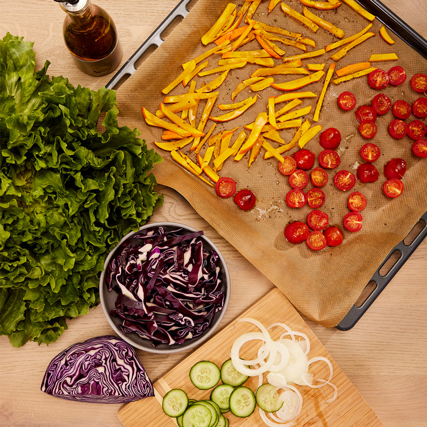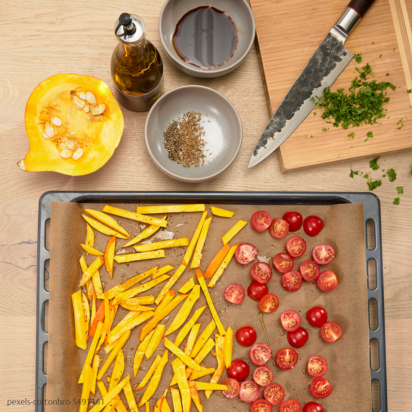 Den Kürbis in etwa 1 cm dicke Spalten schneiden. Öl mit Zitronenschale, 1 TL Kreuzkümmel und Salz verrühren. Den Kürbis darin wenden. Kürbis und Tomaten auf ein mit Backpapier belegtes Blech legen und im Backofengrill (240 °C, zweite Schiene von oben) 15–20 Minuten goldbraun grillen.