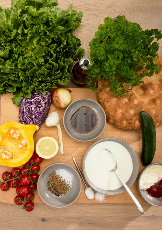 Fladenbrot überkreuz vierteln und jeweils waagerecht einschneiden. Kurz vor Ende der Kürbis-Garzeit im Ofen erwärmen. Zum Füllen: Cocktailsoße, Gemüse, Salat und Kürbis ins Fladenbrot geben, Kräutersoße drüberträufeln – genießen!