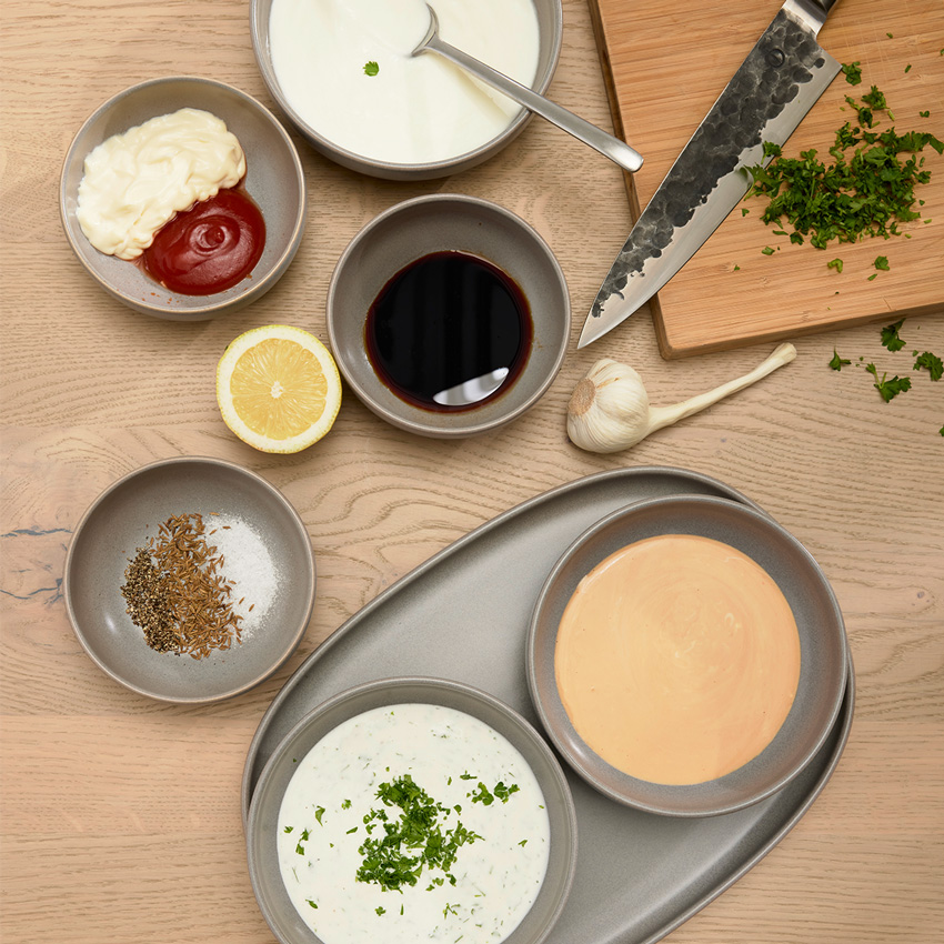 Knoblauch hacken. Mit Joghurt, Mayo und Zitronensaft verrühren. Die Hälfte der Joghurtsoße mit Ketchup und Sojasoße zur Cocktailsoße mischen. Die Petersilie fein hacken und mit der restlichen Joghurtsoße zur Kräutersoße verrühren. Mit Salz, Pfeffer und Kreuzkümmel abschmecken.