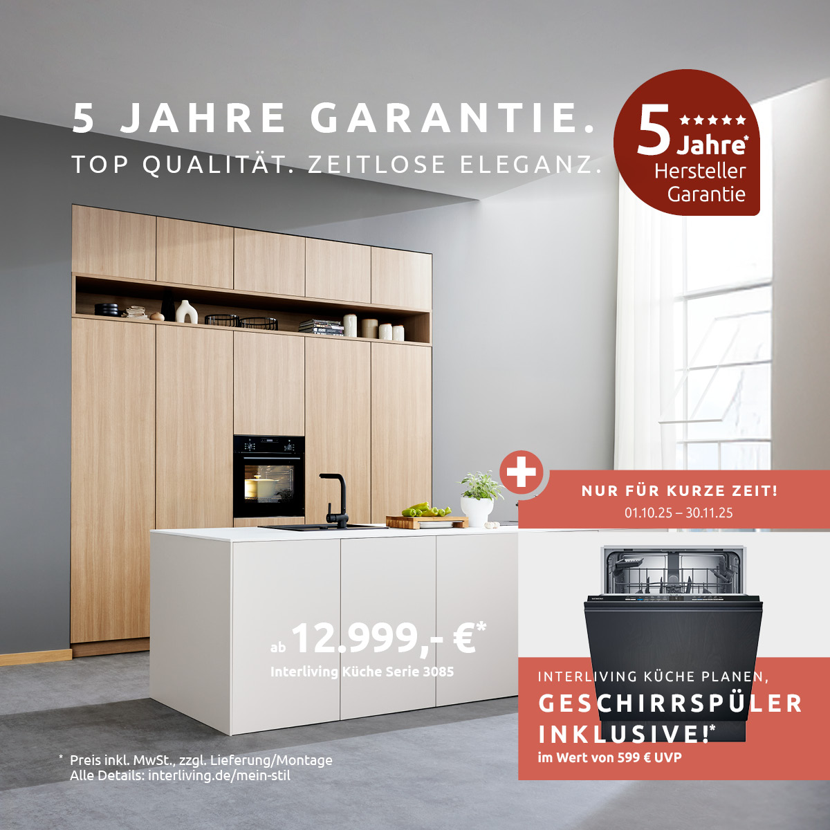 Bei Planung einer Interliving Küche erhältst du einen Siemens Geschirrspüler SN6IX14TE im Wert von 599 € UVP inklusive. UVP des Herstellers: 599 €, Stand: 10/2025. Gilt nur für Neuverträge frei geplanter Küchen im Aktionszeitraum 01.10.25 - 30.11.25.